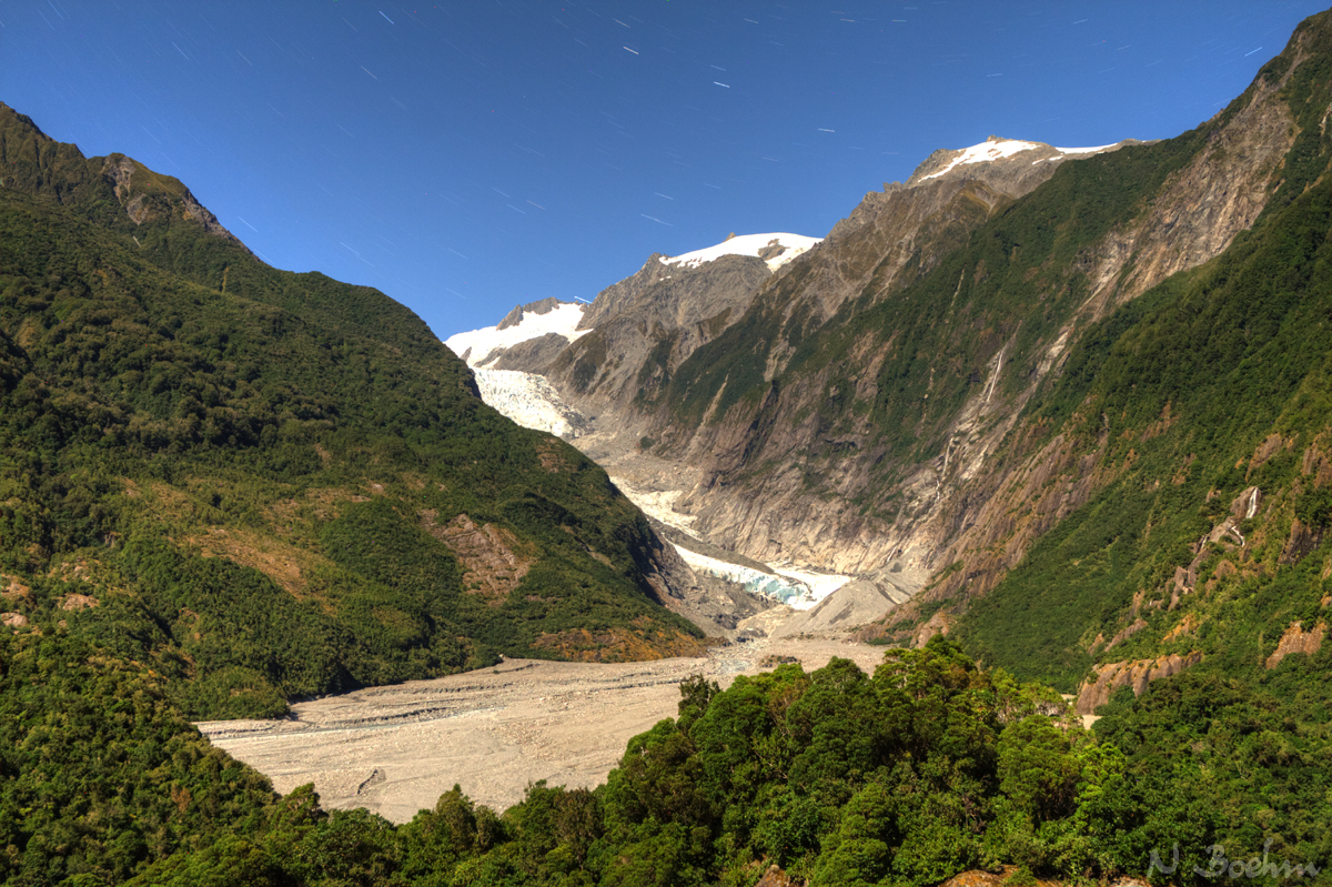 The Franz Josef Glacier descends from the Southern Alps and passes through the temperate wet New Zealand forest.